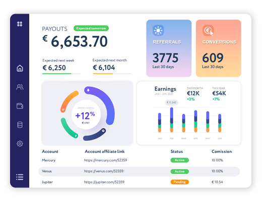 Earn up to €700 for each new customer. Receive the payments daily or weekly via bank transfer, card, e-wallet, or PayPal.